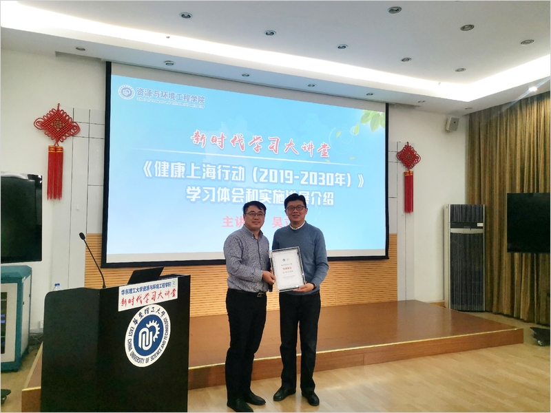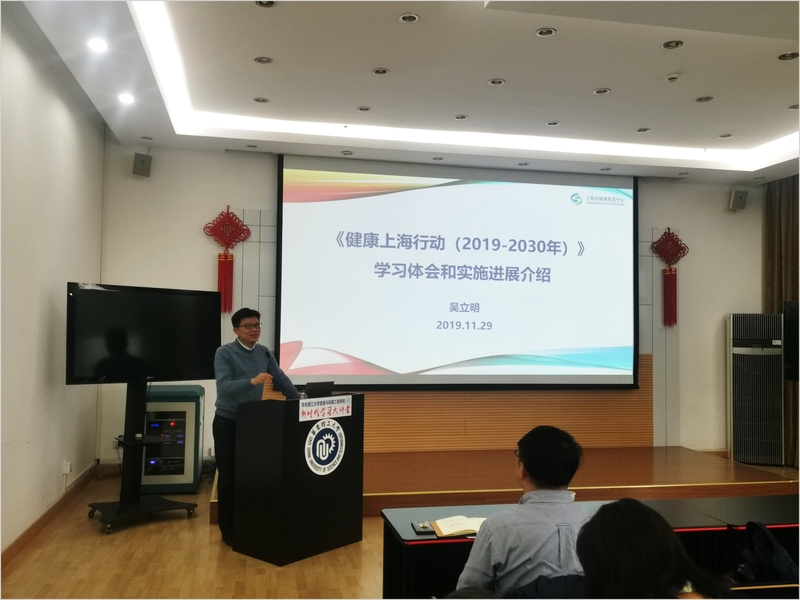 11月29日下午,太阳集团tyc539在徐汇图书馆201举办了第七期“新时代学习大讲堂”,特邀上海市健康促进中心主任吴立明为大家解读《健康上海行动(2019-2030年)》。学院教职工、学生党员和入党积极分子、党政班子成员参加报告会,会议由学院党委书记修光利主持。