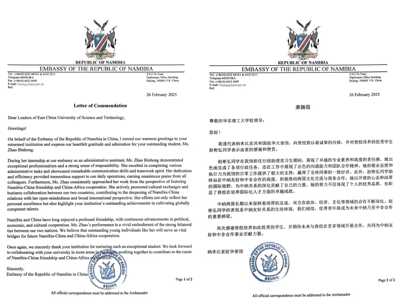 Recently, the Embassy of the Republic of Namibia in China sent a letter of thanks to the East China University of Science and Technology to praise the excellent performance of the student Zhao Binhong of the program, Energy and Power Engineering of 2021, the School of Resource and Environmental Engineering, during the period when she served as an administrative assistant during her internship at the embassy, sincerely thank and appreciate the remarkable achievements made by the East China University of Science and Technology in terms of international talent training, and expected that it could cooperate with the university in more fields in the future and jointly contribute to the cooperation between China and Africa and the friendship between China and the Republic of Namibia.
